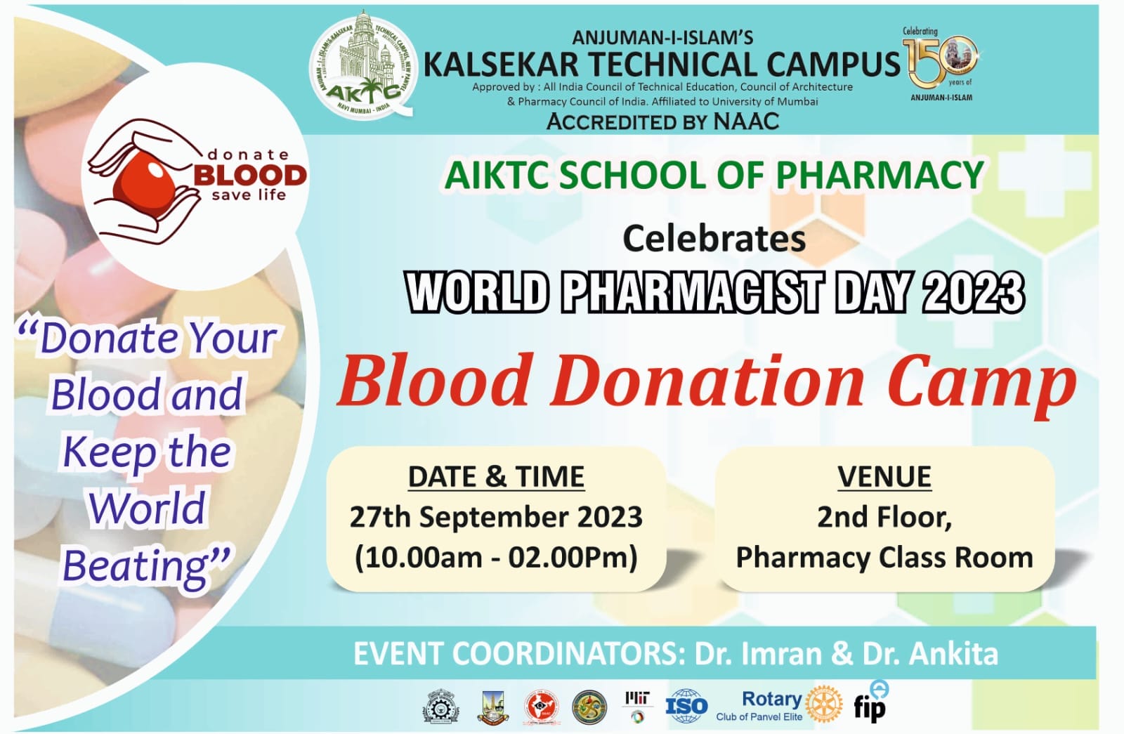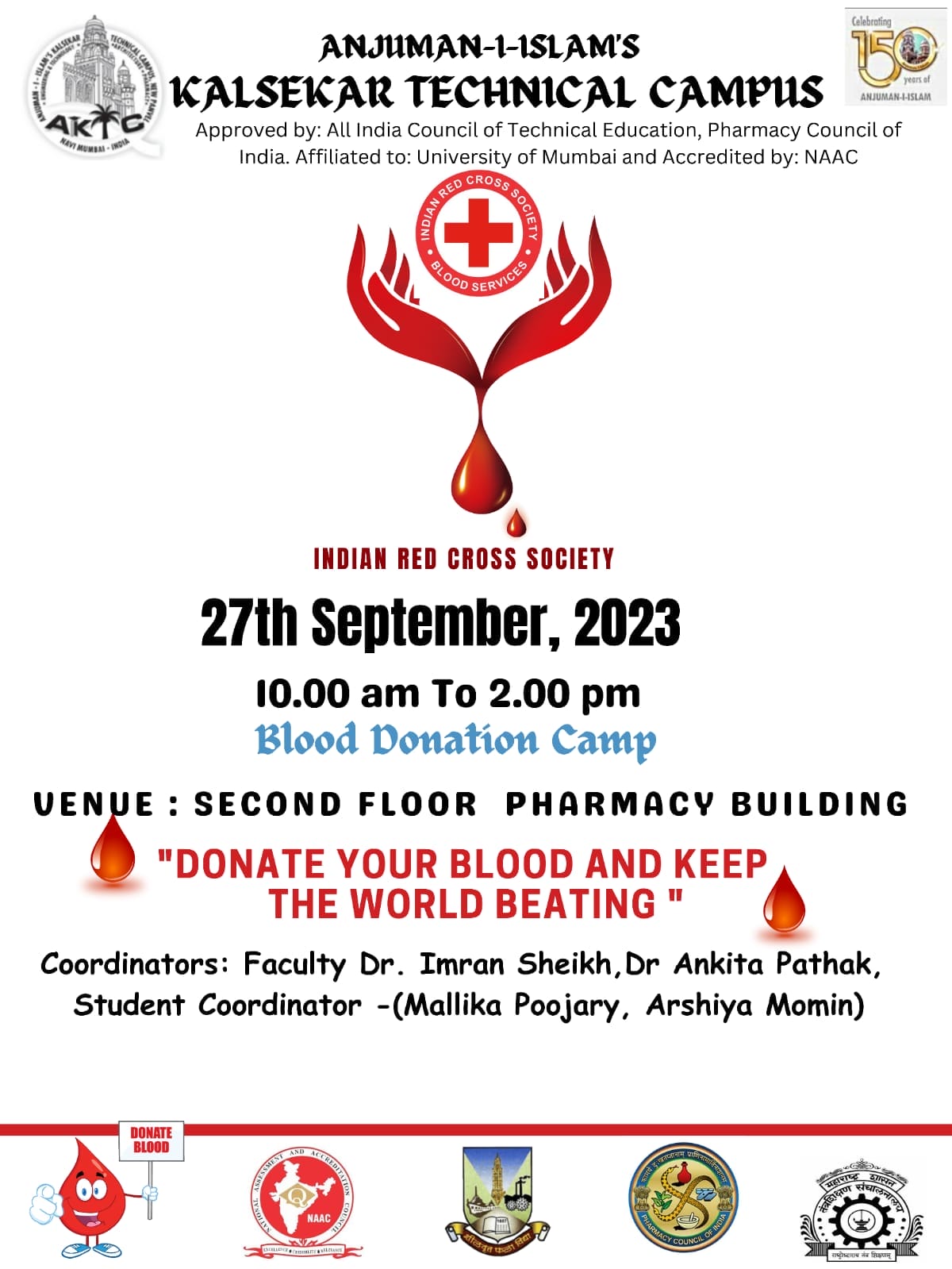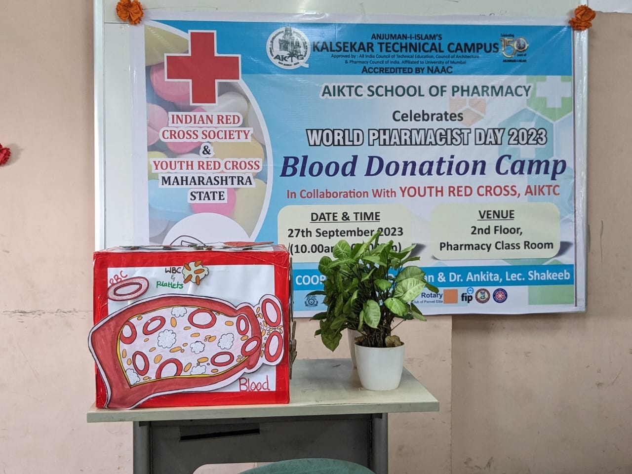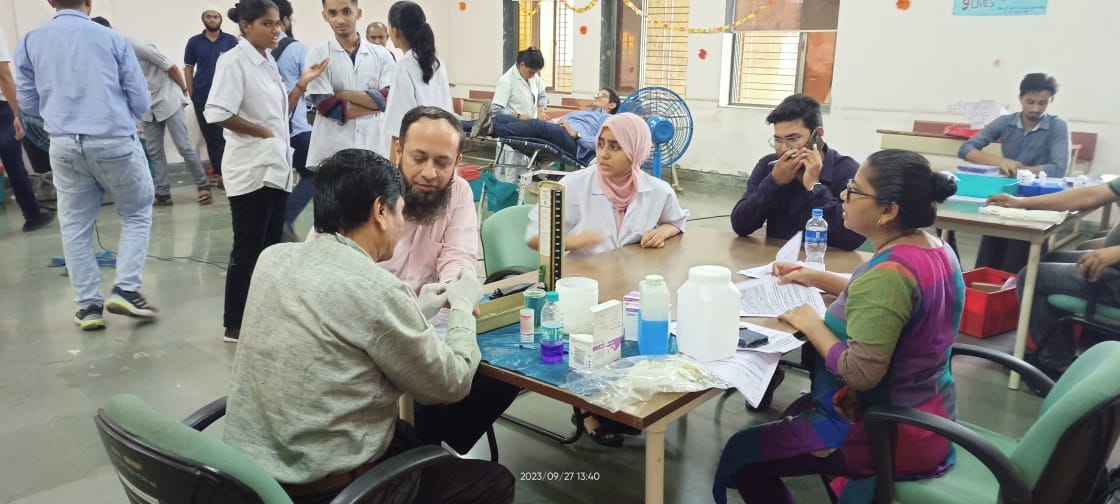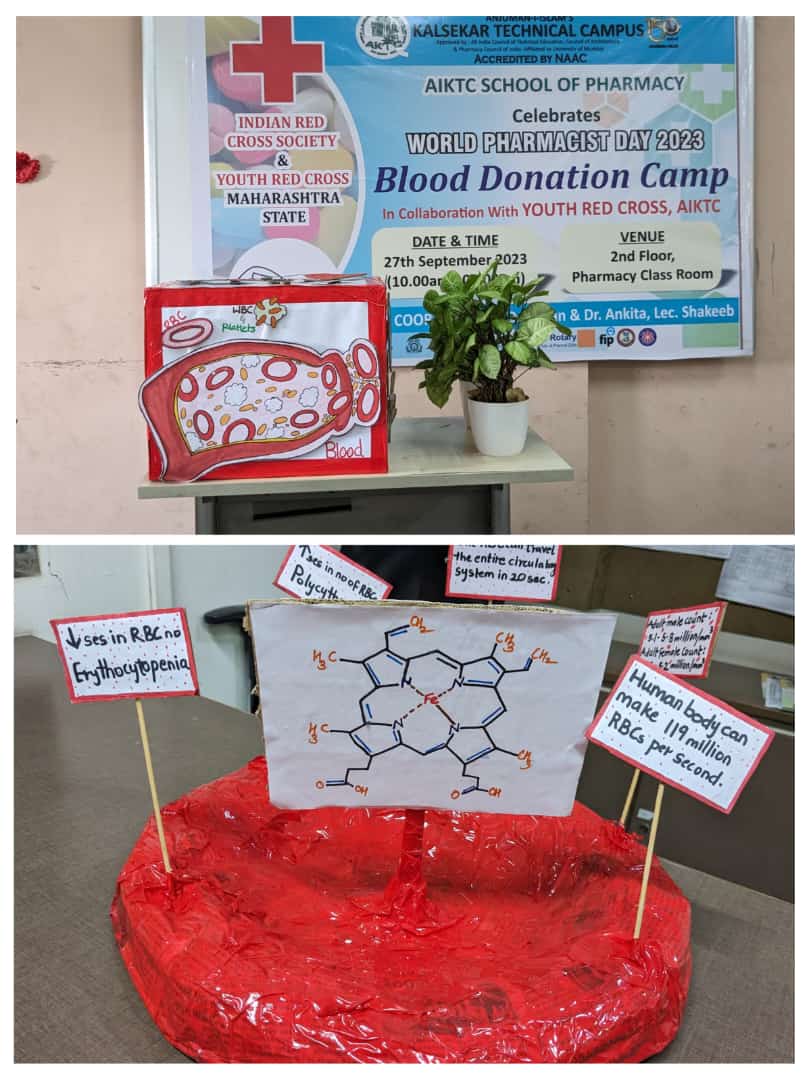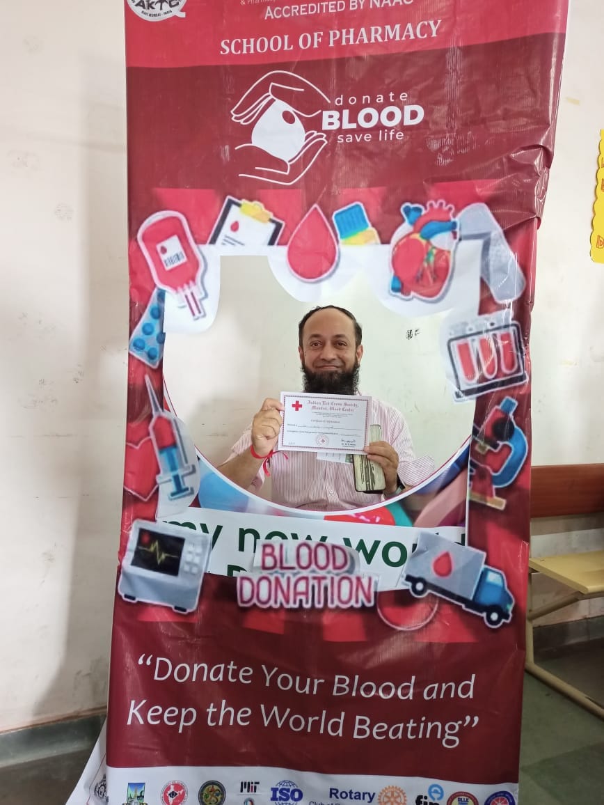 On the occasion of World Pharmacist Week, a Blood donation Camp was organized by Anjuman-I-Islam Kalsekar Technical Campus, School of Pharmacy on 27th Sep 2023 at Second floor Pharmacy building in association with a well renowned society " RED CROSS SOCIETY". Total 80 participants were found eligible for blood donation and donated blood.