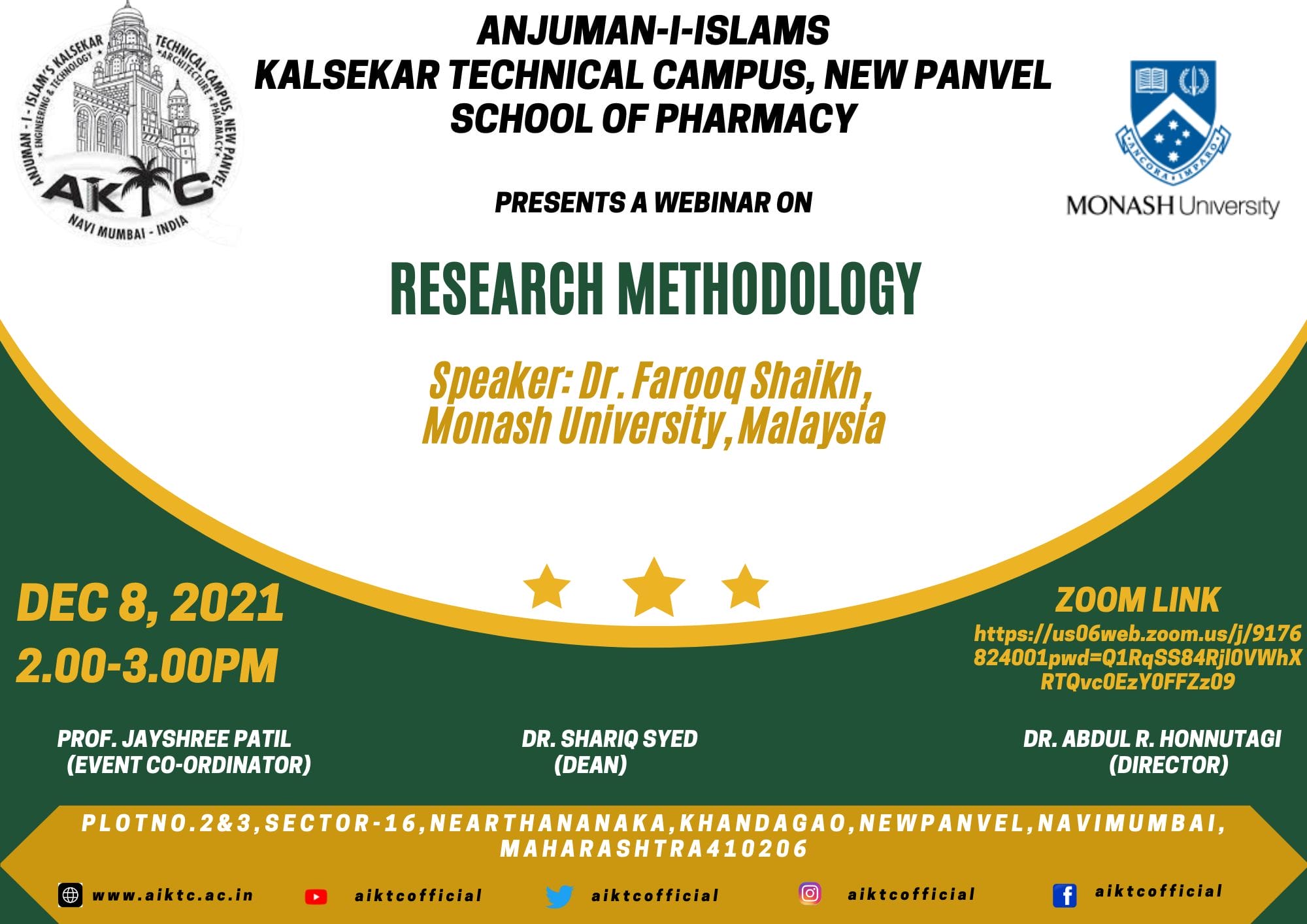 Research methodology is the specific procedures or techniques used to identify, select, process, and analyze information about a topic. To begin with the projects for B Pharm Final Year students, who are doing projects for the first time as per curriculum, the session on ‘Research Methodology’ by Dr. Farooq Shaikh, Neuropharmacologist, Monash University, Malaysia is arranged expecting to clear concepts of research hypothesis, research methods and methodology