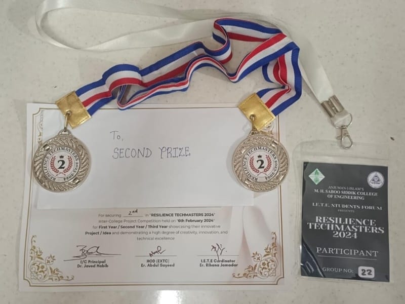 Two of our students, Talha Shaikh and Altamash Momin from the Final Year of the Mechanical Engineering Department, participated in the "Resilience Techmasters," an innovative project or idea competition organized by M.H. SABOO SIDDIK COLLEGE OF ENGINEERING under their I.E.T.E. institute level chapter, held on 6th February. The competition comprised two rounds, namely, the Presentation of Idea and the Prototype Presentation. Their project titled "Staircase Climbing Mechanism For Wheel Chair," guided and mentored by Prof. Zakir Ansari, secured the 2nd prize. It is noteworthy that over 100 teams participated in the first round, and out of these, 25 teams, including ours, advanced to the round 2 finale held on 6th February. Our students' achievement is a testament to their hard work, dedication, and innovative spirit.