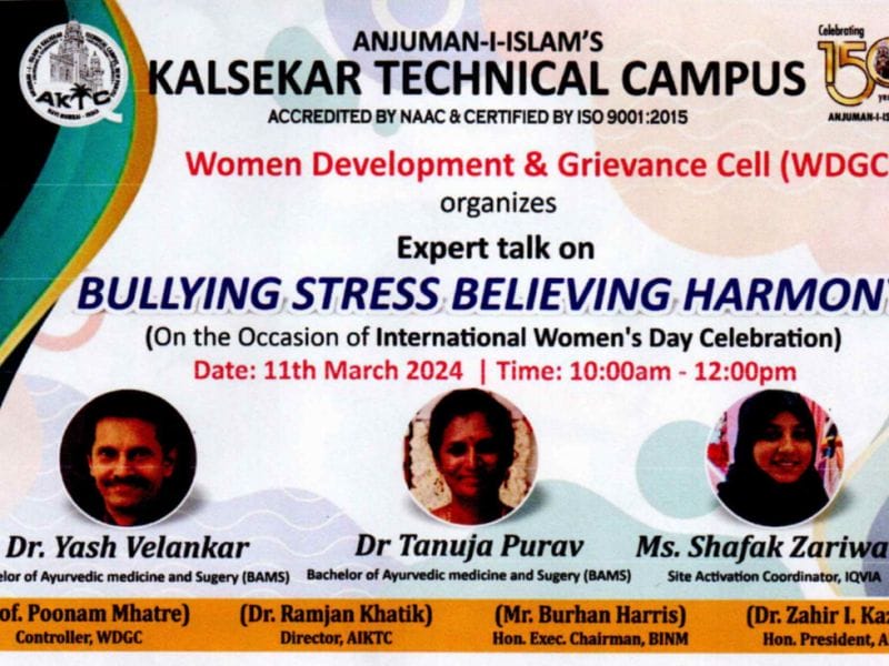 The Central Library in collaboration with the Women Development and Grievances Cell (WDGC), celebrated International Women's Day from March 1st to 15th, 2024. The event featured a variety of activities aimed at honouring and empowering women within the AIKTC community. Activity 1: Thematic Display / Wakelet Thematic Diplay: Showcased books and resources highlighting women's achievements and contributions. Wakelet: Curated online collections celebrating influential women and gender equality. Objectives: To inculcate reading habits by encouraging students to read more about Dr. Kalam Date: 1 — 15 March 2024 Location/Mode: Offline / Online, Central Library Visitors: 22 Students & 2 Faculties Activity 2: e- quiz Thematic Diplay: Engaged participants to gather knowledge about Women's history and rights Date: 1 — 15 March 2024 Location/Mode: Online Participants: 12 Students & 2 Faculties E certificate was given to the winner and to the participants. Activity 3: Eapert Talk Expert Talk by Doctors: On the occasion of International Women's Day, AIKTC organized an expert talk on "Bullying Stress Believing Harmony," delivered by Dr. Yash Velankar and Dr. Tanuja Purav, both esteemed practitioners with a Bachelor of Ayurvedic Medicine and Surgery. Held on March 11th, the session specifically targeted female students, faculty, and staff, addressing crucial issues related to bullying, stress management, and achieving harmony in both personal and professional spheres.