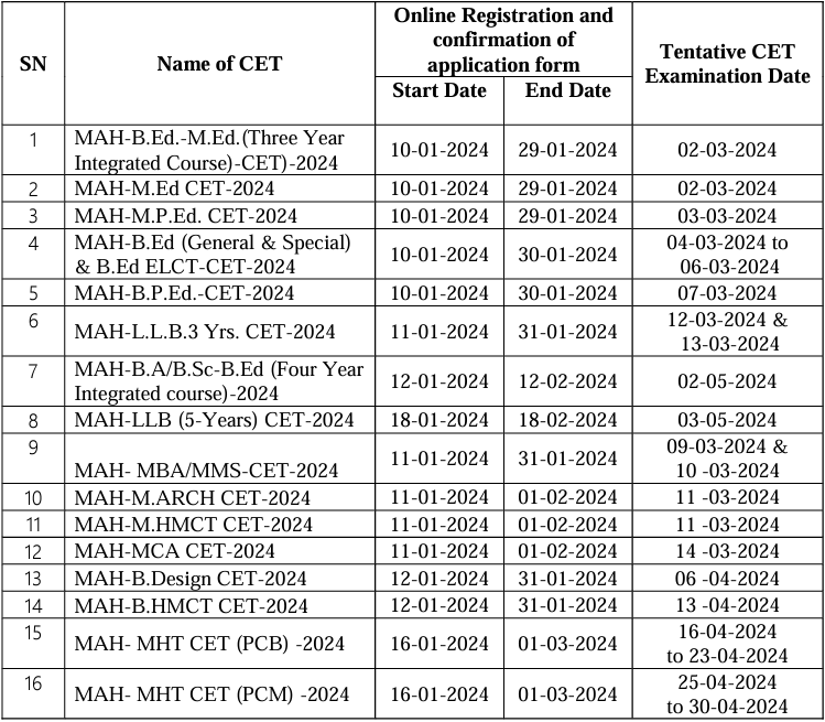 CET Examination for the Courses given in the table is being conducted by State Common Entrance Test Cell, Mumbai for the academic year 2024-25. The CET Examination for the said courses will be conducted at various examination centres within and outside Maharashtra State. Candidates have to submit the online application form for the said examination as per the schedule given in the table below.