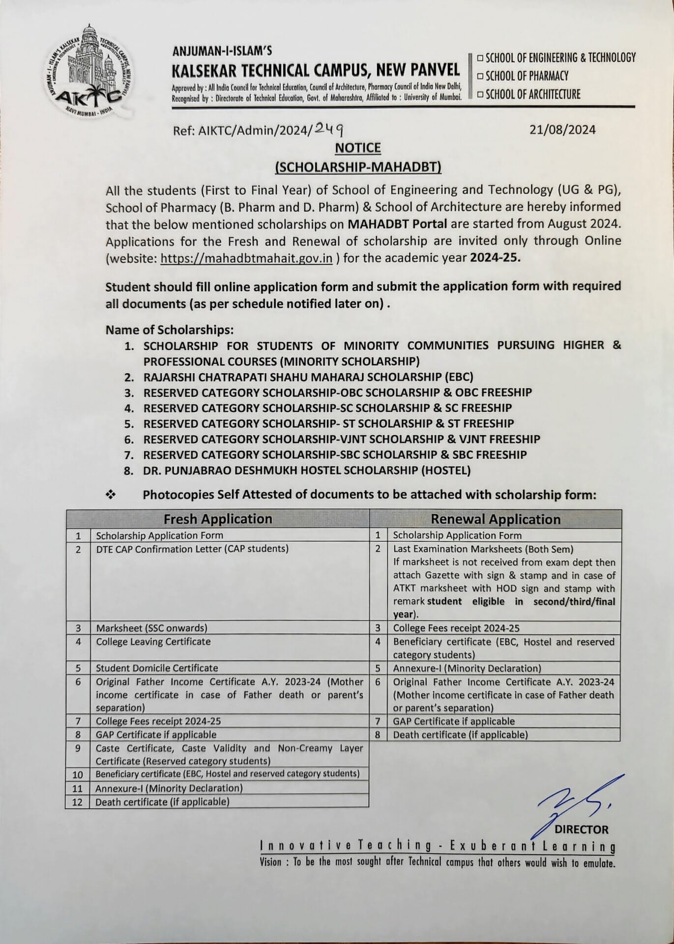 All the students of AIKTC ( SoET/SoP/SoA) are hereby informed that the MahaDBT Scholarship has been started from August 2024 for the academic year 2024-2025.