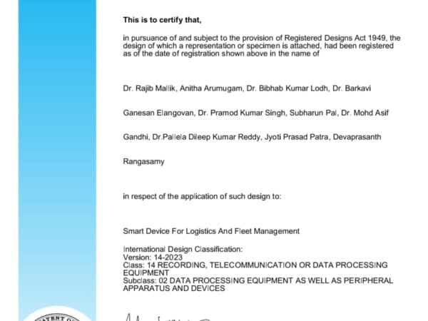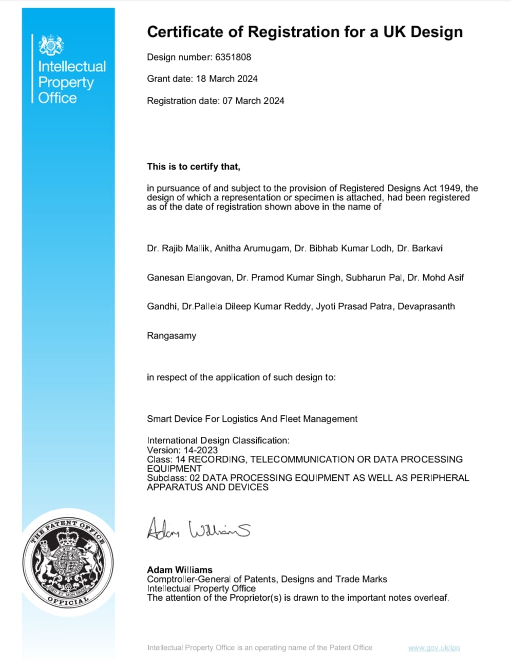 Dr. Mohd. Asif Gandhi, working as Associate Professor in Department of Mechanical Engineering in the School of Engineering and Technology at Anjuman-I-Islam’s Kalsekar Technical Campus, New Panvel; and also holding additional charge as Controller (IPR, R&D Projects, Publications, and Internal Revenue Generation) registered his Design Patent titled “Smart Device for Logistics and Fleet Management” with the Intellectual Property Office, U.K. His U.K. Design patent has been granted on 18th March, 2024.