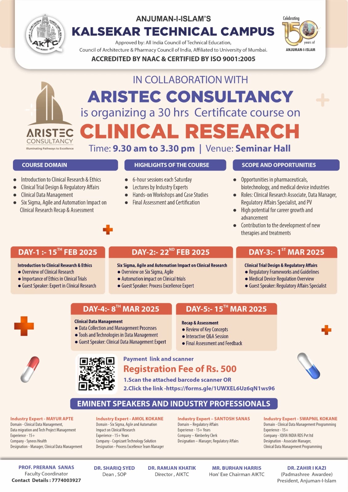 Anjuman-I-Islam’s Kalsekar Technical Campus (AIKTC), in collaboration with Aristec Consultancy, is organizing an intensive 30-hour certificate course on Clinical Research. Scheduled to take place at the Seminar Hall, the program will run across five Saturdays from February 15 to March 15, 2025, from 9:30 AM to 3:30 PM.
